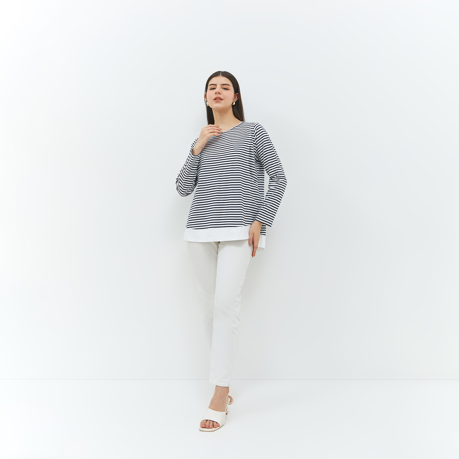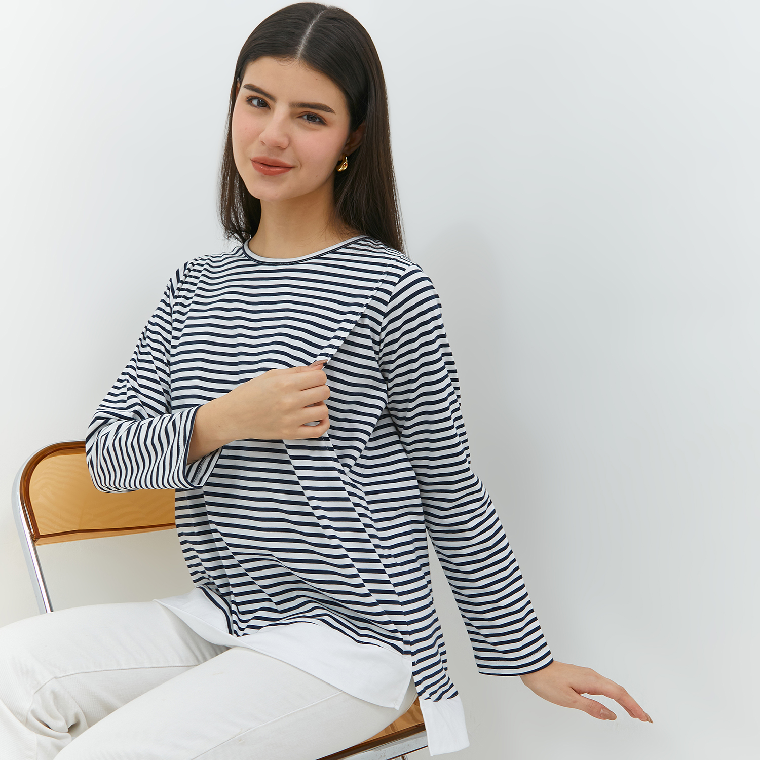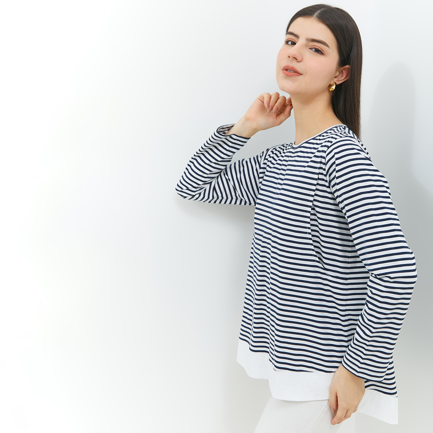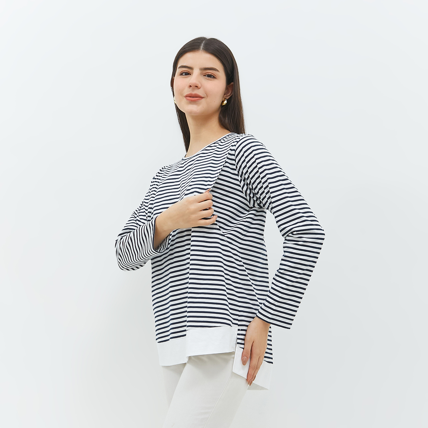 Malca blouse ini terbuat dari kombinasi bahan kaos stripe dan combed polos yang memiliki permukaan halus dan terasa dingin sehingga nyaman digunakan moms. Memiliki bukaan menyusui kanan dan kiri tanpa kancing dan tanpa resleting sehingga memudahkan mom saat akan menyusui si kecil. Cocok dipakai saat masa kehamilan sampai menyusui.