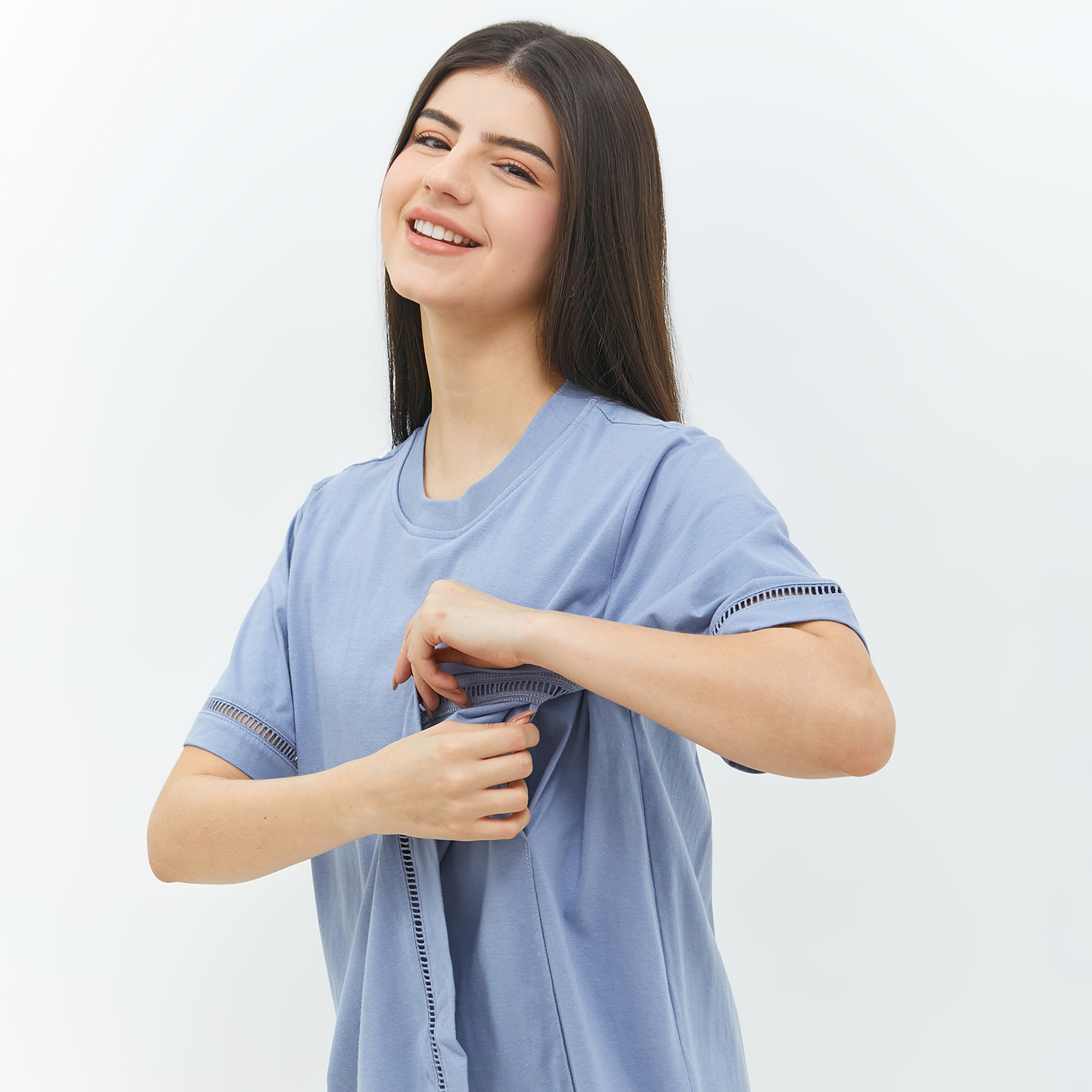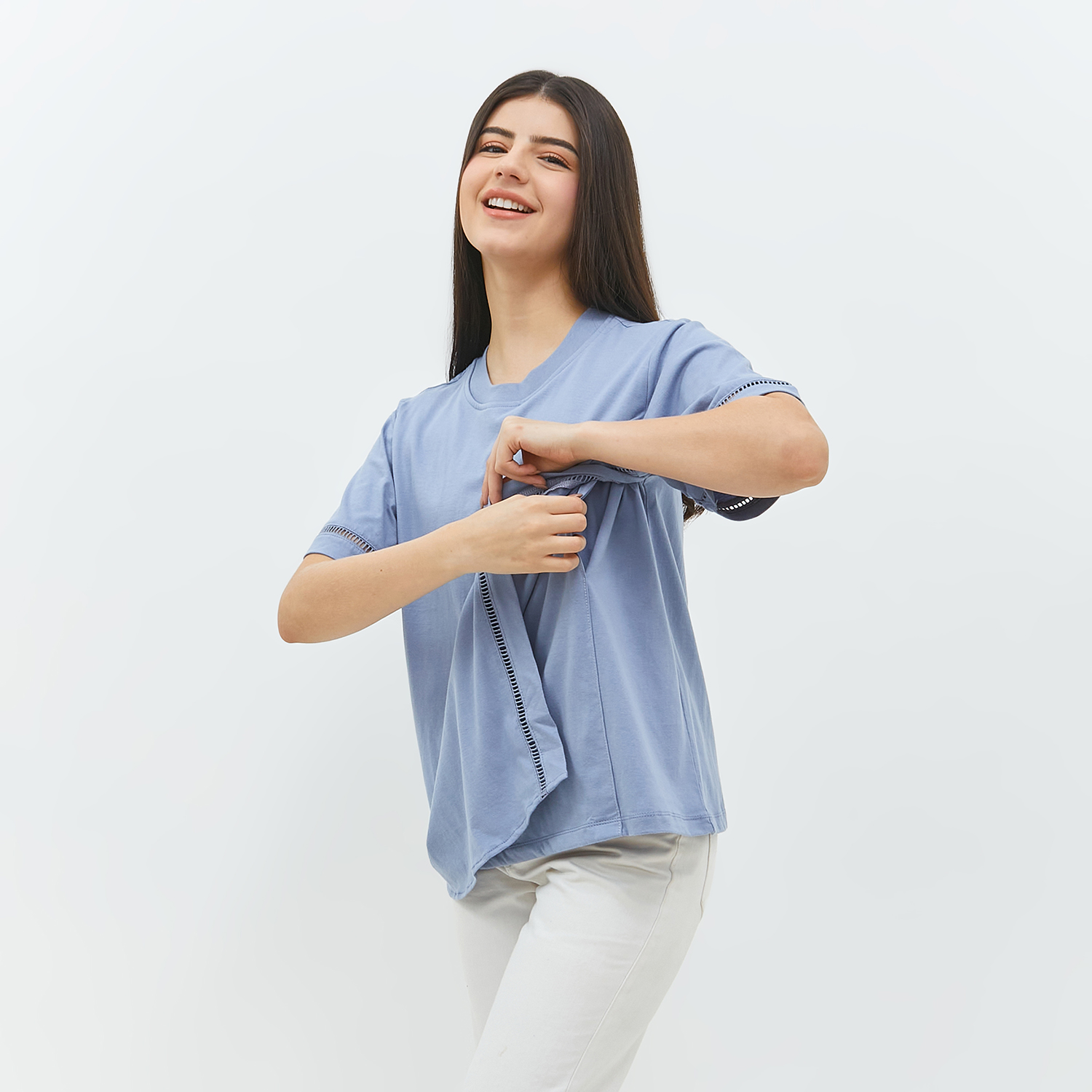 Rabia blouse ini terbuat dari bahan combed 30’s, yang 100% cotton yang memiliki permukaan halus dan terasa dingin sehingga terasa nyaman digunakan moms. Bukaan menyusui kanan dan kiri tanpa kancing dan tanpa resleting sehingga memudahkan mom saat menyusui si kecil. Rabia blouse ini memiliki aksen renda sehingga menambah manis tampilan mom.